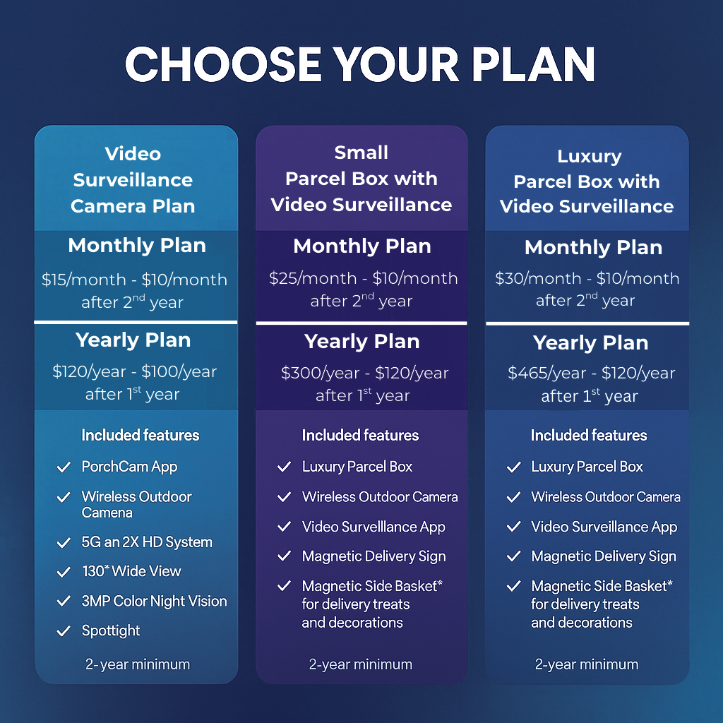 Choose from monthly or annual subscription plans starting at $15 per month. Whether you go with just the camera or the full parcel box setup, every plan includes full PorchCam app access, live delivery alerts, and equipment warranty coverage.